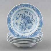 Zes Chinees porseleinen diepe borden met blauw-wit decor van bloemen en een kist, Qianlong -één met haarlijn, één met gelijmde rand-, Ø 24 cm