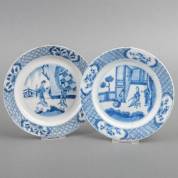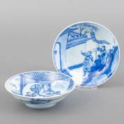 Twee Chinees porseleinen lage kommen op voet, beide met blauw-wit decor: man aan tafel droomt over vrouw -randchips en gerelateerde haarlijn-, en: figuren bij muur -randchip en bakfoutje in rand-, beide gemerkt met hetzelfde zeskaraktermerk, Kangxi, 4,5 × Ø 16 cm