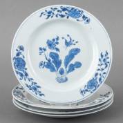 Serie van vier Chinees porseleinen borden met blauw-wit decor: vlinder bij bloem, 18e eeuw -randchips-, Ø 23 cm