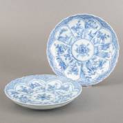 Paar Chinees porseleinen borden met blauw-wit decor: afwisselend bloem- en landschapsdecor in lotusvormige vakverdeling, de gecontourneerde rand met servetwerk, eerste helft 18e eeuw -één met haarlijn, beide met randchipjes-, Ø 21 cm