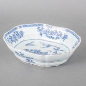 Chinees porseleinen slakom met blauw-wit decor van vogels en bloemen, Qianlong, 8 × 30 × 24 cm