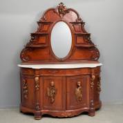Mahonie en eiken open bonheur, de spiegelopstand bekroond door een gesneden zwijnenkop en gedecoreerd met druiventrossen en peren, onder het witte marmeren blad twee lades en vier deuren, gedecoreerd met gesneden hondenkoppen, zwijnenkoppen, fruit, en gevogelte, Willem III -hoekprofielen opstand ontbreken, enkele profielen en planken in de opstand wijken, geen sleutels, de zijdeuren zitten op slot-, 221 × 178 × 62 cm