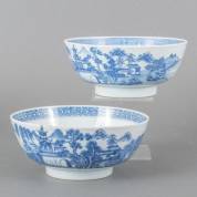 Paar Chinees porseleinen kastkommen met blauw-wit landschapsdecor, Qianlong -klein randchipje-, Ø 20,5 cm