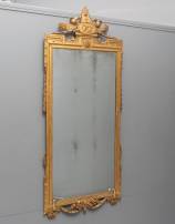Kwikspiegel in vergulde lijst, bekroond door ornament met tortelduiven, pijlenkoker, fakkel en medaillon met drie putti, Louis Seize-stijl en waarschijnlijk uit de periode -sporen van de tand des tijds-, 162 × 66 cm