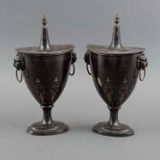 Paar tinnen tôle peinte kastanjevazen met leeuwenmascarons en rankendecor op gehoute achtergrond, eerste helft 19e eeuw -enkele slijtages aan lakwerk-, 31 × 18 × 12 cm