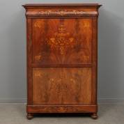 Mahoniegefineerde secretaire met inlegwerk op de klep en deuren, en bovenin een lade, biedermeier -kras en fineerschade op linker zijkant, kleine krimpscheuren in klep en deuren, enkele ladetrekkertjes ontbreken binnenin, natuurstenen bovenblad ontbreekt-, 153 × 106 × 49 cm