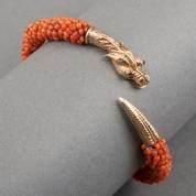 Spangarmband gemaakt uit gedraaide streng bloedkoralen kraaltjes, de uiteindes met vergulde drakenkop en staart, de ogen gezet met rood glas, 19e eeuw, brutogewicht 21 gram, binnenmaat 5,5 × 6 cm