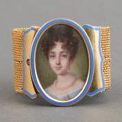14kt gouden armband gevormd uit twee banen van gematteerd maliënvlechtwerk, centraal gezet met portretmedaillon functionerend als bakslot en tevens los te dragen als hanger, gedecoreerd met blauw emaille banden, circa 1830, brutogewicht 56,8 gram, gewicht zonder medaillon 35 gram, lengte circa 16 cm, in lederen etui gemerkt Vincent Goldsmith onder kroon -kleine defecten aan vlechtwerk-