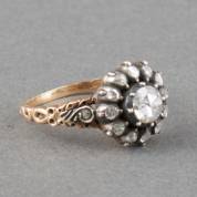 14kt gouden en zilveren rozetring gezet met centraal één grote roosdiamant waaromheen veertien kleine roosdiamanten, meester: L.S. van Meggelen, 's-Gravenhage, 20e eeuw, brutogewicht 4,8 gram, mt. 18,5