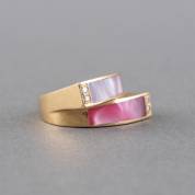 18kt gouden slagring, Diamonde, gezet met twee kleuren roze parelmoer en vier briljantgeslepen diamanten, mt. 16,5, brutogewicht 11,0 gram