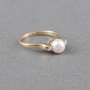 14kt gouden ring gezet met gecultiveerde parel, geflankeerd door twee briljantgeslepen diamanten, mt. 17, brutogewicht 2,4 gram