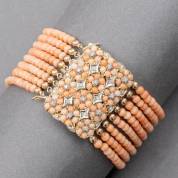 Acht-strengs angelskin koralen armband aan BWGG bakslot en twee BWGG verdelers, het slot gezet met angelskin koraal en achtkantgeslepen diamanten, brutogewicht 47,8 gram, 19 cm