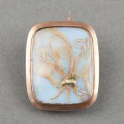 Rechthoekige BWGG rouwbroche, ook als hanger te dragen, met haarwerk, zaadpareltjes en gouden monogram 'R J G', op lichtblauwe achtergrond, brutogewicht 8,2 gram, 3,2 × 2,5 cm -letter los-