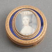 Ronde 14kt gouden doos met 14kt roségouden binnenrand, geguillocheerd zilver met blauw geëmailleerd, het deksel gezet met ovaal portretmedaillon van dame met hoed waaromheen zaadparels, meesterteken onduidelijk, essayeursteken Henri Clavel, Parijs, 1784, brutogewicht 69 gram, Ø 5,7 cm -portretmedaillon en binnenrand los, defecten aan binnenwerk-