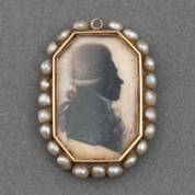 Octagonale 14kt gouden silhouetportrethanger omlijst door zaadpareltjes, begin 19e eeuw, brutogewicht 6,2 gram, 3,2 × 2,2 cm -draagoog ontbreekt, barstje in portret, goudgehalte getoetst-