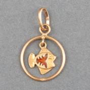 18kt gouden cirkelvormige hanger met bewegend visje met email decor, brutogewicht 2,2 gram, Ø 18 mm