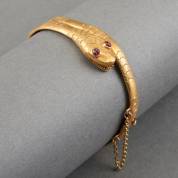 22kt gouden stijve armband gevormd als slang, gegraveerd met schubben, de ogen gezet met granaat, voorzien van veiligheidskettinkje, gewicht 59,8 gram, binnenmaat 6 × 5,5 cm -een granaat gebroken-