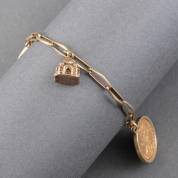 14kt gouden closed-forever armband met bedel gevormd als moskee, twee gouden munthangers met gouden tientjes: Wilhelmina, 1925, en Willem III, 1876, en gouden munthanger met 50 Unie Daalder, Unie van Utrecht, 1979, gewicht 35,8 gram, lengte 20 cm