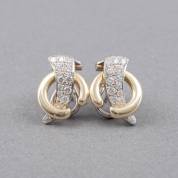 Paar geel- en witgouden oorstekers met clipsluiting, deels pavégezet met briljantgeslepen diamanten, totaal circa 0.60ct, brutogewicht 6,4 gram, 11 mm