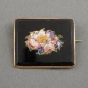 Rechthoekige zwart stenen broche met micromozaïek van boeket in 14kt gouden montuur, brutogewicht 22,6 gram, 4,2 × 3,5 cm -kleine defecten-
