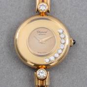 18kt gouden damespolshorloge, Chopard, Happy Diamonds, designer Kuchinsky, handopwind uurwerk, goudkleurige wijzerplaat met acht bewegende diamanten, kastnummer 182211 4045, aan 18kt gouden band, de bandaanzet eveneens met diamant gezet, totaal circa 0.12ct diamant, brutogewicht 22,4 gram, draaglengte 16,5 cm, Ø 20 mm