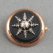 Ronde 14kt roségouden rouwbroche gezet met onyx waarop een stervormig 1e gehalte zilveren montuur gezet met roosdiamantjes, 19e eeuw, brutogewicht 8,4 gram, Ø 2,3 cm -speld van later datum-