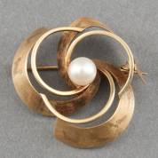 14kt gouden broche, deels gesatineerd en centraal gezet met gecultiveerde parel, brutogewicht 5,8 gram, 3 cm
