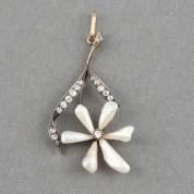 14kt gouden en zilveren bloemvormige hanger gezet met keshiparels en oudslijpsel diamanten, brutogewicht 3,8 gram, 5 cm