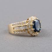 18kt gouden ring gezet met ovaal gefacetteerde donkerblauwe saffier, omgeven door briljantgeslepen diamanten, totaal circa 1.0ct, mt. 17,75, brutogewicht 10,4 gram