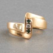 14kt gouden slagring gezet met briljantgeslepen diamant, geflankeerd door twee achtkantgeslepen groene toermalijnen, mt. 17, brutogewicht 6,8 gram