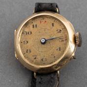18kt gouden damespolshorloge, eerste helft 20e eeuw, brutogewicht gewogen zonder bandje, brutogewicht gewogen zonder bandje 12,4 gram, Ø 25 mm -glas ontbreekt en gebruikssporen-