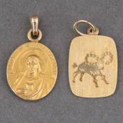 Twee 14kt gouden plaathangers, één met gegraveerd sterrenbeeld 'steenbok', de ander een zogenaamd Heilig Hart, gewicht 3,4 gram, beide 2,2 cm