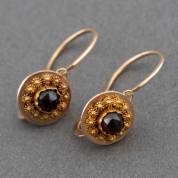 Paar 14kt gouden oorhangers gezet met gefacetteerde granaat omgeven met spinnetjes, brutogewicht 1,6 gram, Ø 0,8 cm