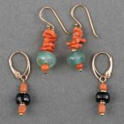 Twee paar verguld 1e gehalte zilveren oorhangers één paar met bloedkoraal en onyx, het andere paar met bloedkoraal en agaat, circa 3,5 cm