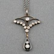14kt gouden art nouveau hanger met veertien diamanten in oud slijpsel gezet in zilver, aan 14kt witgouden jasseron schakelcollier met veiligheidskettinkje en extra verlengstukje van de hanger met vijf diamantjes, brutogewicht 4,8 gram, 38 cm, hanger 3 cm