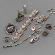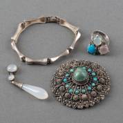 Diverse zilveren sieraden, diverse gehaltes, waaronder: filigrain armband gezet met cabochongeslepen natuurstenen; collier met groen email; en vergulde hanger gezet met cabochongeslepen jade, brutogewicht 120 gram -één fijn collier gebroken-