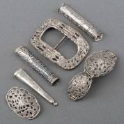 Divers klein zilverwerk: diverse gehaltes en jaren bestaande uit: zilveren gesp, breidop, opengewerkte armband en broche -herstelling-, en twee Mezuzahs, brutogewicht 73 gram