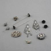 Diverse zilveren sieraden, veelal 2e gehalte zilver: paar filigrain oorhangers, paar bloemvormige oorhangers, paar bloemvormige hoedenspelden, filigrain slot, bloemvormige broche met parel en broche van Zeeuwse knoopjes, brutogewicht 29,2 gram