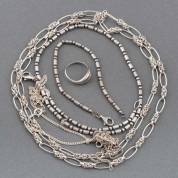 Diverse zilveren sieraden, diverse gehaltes, waaronder: 1e gehalte zilveren collier en armband met buis-en bolkralen, gewicht 62,8 gram, collier 42 cm, armband 19 cm, ring mr. 17,75