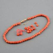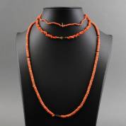 Drie strengen bloedkoraal, één splitkralen aan onedele sluiting, één met kleine kralen aan14kt gouden kapittelslot, en één met kaaskralen aan zilveren veerring, langste collier 76 cm