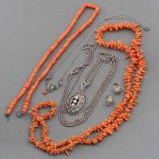Twee bloedkoralen kralencolliers, twee zilveren colliers, waaronder één met bolletjes, en paar zilveren oorschroeven gezet met markasiet, brutogewicht zilver 27,4 gram, bolletjescollier circa 150 cm