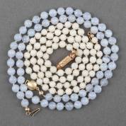 Collier van chalcedoon kralen, aan 14kt gouden bakslotje, en wit kralen collier aan 14kt gouden sluiting, wit collier 50 cm, licht blauw collier 45 cm