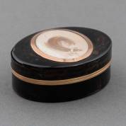 Ovaal schildpad dekseldoosje met defecte 14kt gouden monturen, het deksel gedecoreerd met haarwerk achter bol glas, brutogewicht 57 gram, 3 × 7 × 5,5 cm