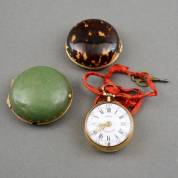Verguld messing herenvestzakhorloge, John Bowditch, met schildpad overkast en groen roggenhuiden overkast met daarin papiersnijwerkje, 18e eeuw, uurwerk: snek, Ø 40 mm -barst in email en sleutel aanwezig-
