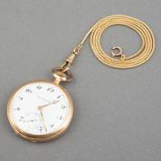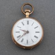 14kt gouden remontoir, met witte wijzerplaat en zwarte cijfers, de achterzijde gegraveerd, brutogewicht 20,8 gram