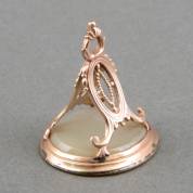 BWGG signet met ingelegd agaat waarin een alliantiewapen: Hubrecht en Van Boetzelaer, vermoedelijk afkomstig van het paar Johanna Françoise Agatha Hubrecht (1753-1819) en Antonie Gustaaf baron van Boetzelaer (1752-1829), getrouwd in 1782, brutogewicht 11,6 gram, 3,5 × 3 × 2,7 cm