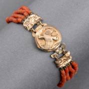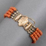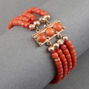 Vierstrengs bloedkoralen armband aan 14kt gouden slot gezet met drie bloedkoralen, brutogewicht 21,5 gram, lengte 17 cm