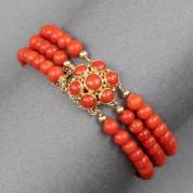 Driestrengs bloedkoralen armband van bolkralen aan 14kt gouden bakslot gezet met een entourage van cabochongeslepen bloedkoraal en veiligheidsketting, 198 cm