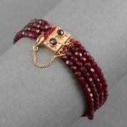 Vierstrengs granaten armband aan 14kt gouden bakslot gezet met twee granaatjes, met veiligheidsketting, brutogewicht 14,8 gram, 18 cm