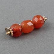 Speld met drie carneolen gehouden in BWGG montuur en onedele pin, brutogewicht 6,4 gram, circa 4 cm -gebruikssporen-